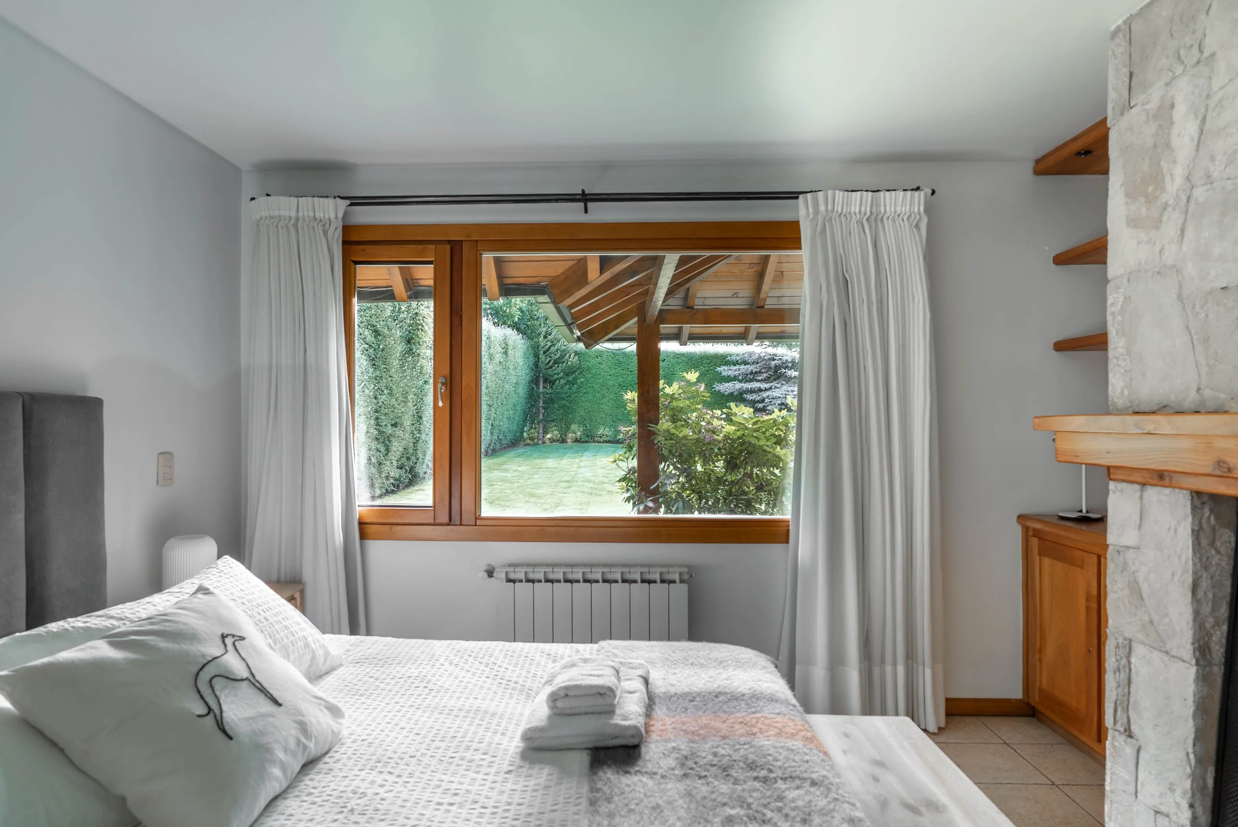 Suite Principal con cama king, vestidor, baño completo con hidromasaje y hogar.